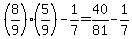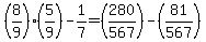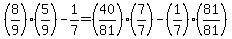 what is 8 over 9 times 5 over 9 - 1 over 7 =