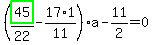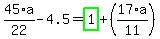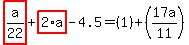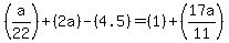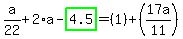 Text form: (a/22)+(2a)-(4.5)=(1)+(17a/11) simplifies to 0=0