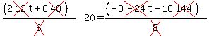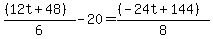 SOLUTION: please help me solve this equation , 1/6(12t+48)-20=-1/8(24t-144) thanks for your time and help!!