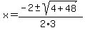 x+=+%28-2+%2B-+sqrt%28+4%2B48+%29%29%2F%282%2A3%29 Multiply -4%2A-4%2A3 to get 48