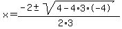 x+=+%28-2+%2B-+sqrt%28+%282%29%5E2-4%2A3%2A-4+%29%29%2F%282%2A3%29 Plug in a=3, b=2, and c=-4