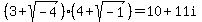 Answer: %283+%2B+sqrt%28-4%29%29%284+%2B+sqrt%28-1%29%29=10+%2B+11i