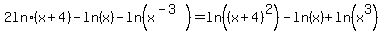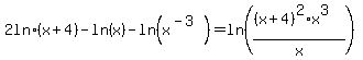 SOLUTION: {{{ 2 ln(x+4) - ln x - ln(x^-3) }}} write each expression as a single logarithms with coefficient of 1.