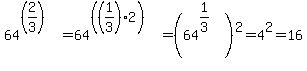 And since multiplcation is Commutative, we can do these two operations in an y order we choose. I choose to find the cube root first because: so finding its cube root will be easy,- Squaring 64 is not appealing,