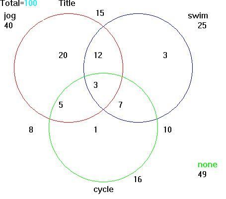 SOLUTION: A survey of 100 persons at Fit Body finds that 40 jog, 25 swim, 16 cycle, 15 both swim and jog, 10 swim and cycle, 8 jog and cycle, and 3 persons do all three. How many people at F