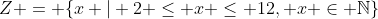 Question 683908: Using correct mathematical notation and symbols, express the following in set-builder notation: Z = {2, 3, 4, 5, 6, 7, 8, 9, 10, 11, 12} and submit it to the Dropbox.