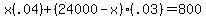 "x amount at 4%, plus $24000-x amount at 3%, equals $800":