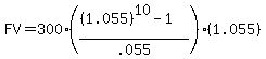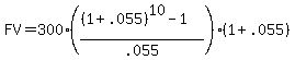 Question 935745: A high-interest savings account pays 5.5% interest compounded annually. If $300 is deposited initially and again at the first of each year, which summation represents the money in the account 10 years after the initial deposit? Answer by ptfile(81) (Show Source):