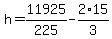 Question 897721: A large grain silo is to be constructed in the shape of a circular cylinder with a hemisphere attached to the top. The diameter of the silo is to be 30 feet, but the height is yet to be determined. Find the height h of the silo that will result in a capacity of 11,925π ft3. Answer by josgarithmetic(39630) (Show Source):