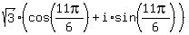 d.	 √3 cis (11π/6)      = sqrt%283%29%2A%28cos%2811pi%2F6%29+%2B+i%2Asin%2811pi%2F6%29%29 = sqrt%283%29%2A%28sqrt%283%29%2F2+%2B+i%2A%28-1%2F2%29%29 = 3%2F2+-+i%2A%281%2F2%29 = 1.5 - 0.5*i.