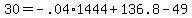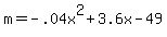 Question 1009294: The gas mileage for a certain vehicle can be approximated by m = −0.04x2 + 3.6x − 49, where x is the speed of the vehicle in mph. Determine the speed(s) at which the car gets 30 mpg. Round to the nearest mph. Answer by josmiceli(19441) (Show Source):