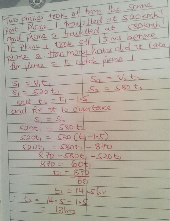 Question 1158821: Both planes were headed on the same route from Alaska to Hawaii. Plane #1 traveled at 520 Km/h and plane #2 traveled at 580 km/h. If plane #1 took off 1 1/2 hours before plane #2, how many hours did it take for plane #2 to catch plane #1? Found 3 solutions by somuahkata@gmail.com, MathTherapy, greenestamps:Answer by somuahkata@gmail.com(7) (Show Source):