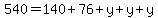 Question 1115910: 140 degrees 76 degrees y degrees and y degrees are angles of a pentagon. calculate y