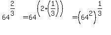 From this we can tell that a squaring will take place (because of the 2) and a cube (aka 3rd) root will be done (because of the 1/3) and that these two operations can take place in either order! So let's choose the order that makes things easiest. Squaring 64 first and then finding the cube root, , does not look very easy. But finding the cube root first and then squaring, , looks good if you realize that . This makes the cube root of 64 = 4 and squaring 4 is easy! So
