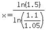 dividing by {[log(1.1)][log(1.05)]} ___ x = log(1.5) / {[log(1.1)][log(1.05)]}