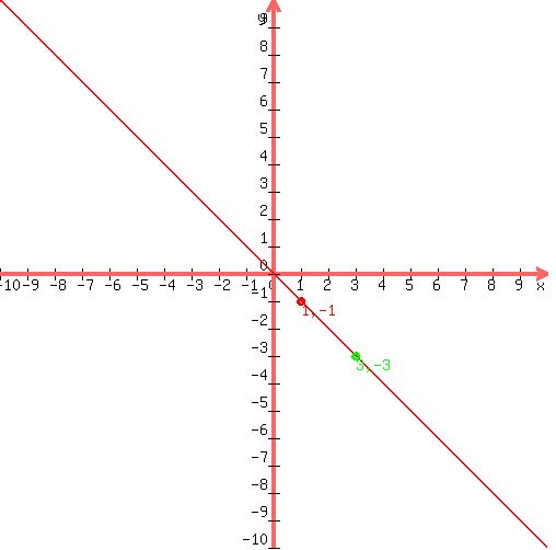 hahaWe are trying to find equation of form y=ax+b, where a is slope, and b is intercept, which passes through points (x1, y1) = (1, -1) and (x2, y2) = (3, -3).