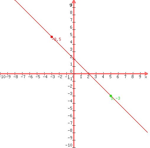 hahaWe are trying to find equation of form y=ax+b, where a is slope, and b is intercept, which passes through points (x1, y1) = (-3, 5) and (x2, y2) = (5, -3).
