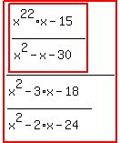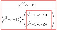 For tutors: simplify_cartoon( ((x^22*x-15)/(x^2-x-30))/((x^2-3*x-18)/(x^2-2*x-24)) )