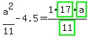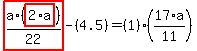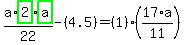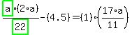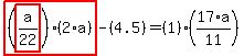 For tutors: simplify_cartoon( (a/22)*(2*a)-(4.5)=(1)*(17*a/11) )