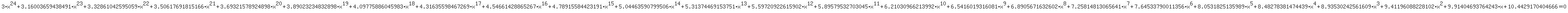 simplifies to  - Text form: 3*x^26=11*x simplifies to +3*x^24+3.16003659438491*x^23+3.32861042595059*x^22+3.50617691815166*x^21+3.69321578924898*x^20+3.89023234832898*x^19+4.09775886045983*x^18+4.31635598467269*x^17+4.54661428865267*x^16+4.78915584423191*x^15+5.04463590799506*x^14+5.31374469153751*x^13+5.59720922615902*x^12+5.89579532703045*x^11+6.21030966213992*x^10+6.5416019316081*x^9+6.8905671632602*x^8+7.25814813065641*x^7+7.64533790011356*x^6+8.0531825135989*x^5+8.48278381474439*x^4+8.93530242561609*x^3+9.41196088228102*x^2+9.91404693764243*x+10.4429170404666=0